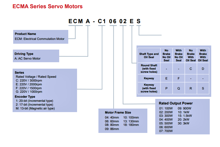 Motor servo Seri ECMA adalah motor servo AC permanen. Ada enam jenis ukuran bingkai: tersedia: 40mm, 60mm, 80mm, 86mm, 100mm dan 130mm. Kecepatan motor hingga 5000 r/ menit dan torsi yang dihasilkan bisa mencapai 21,48 N-m.