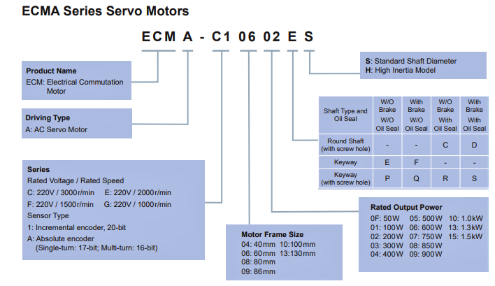 Motor servo Seri ECMA adalah motor servo AC permanen. Ada enam jenis ukuran bingkai: tersedia: 40mm, 60mm, 80mm, 86mm, 100mm dan 130mm. Kecepatan motor hingga 5000 r/ menit dan torsi yang dihasilkan bisa mencapai 21,48 N-m.